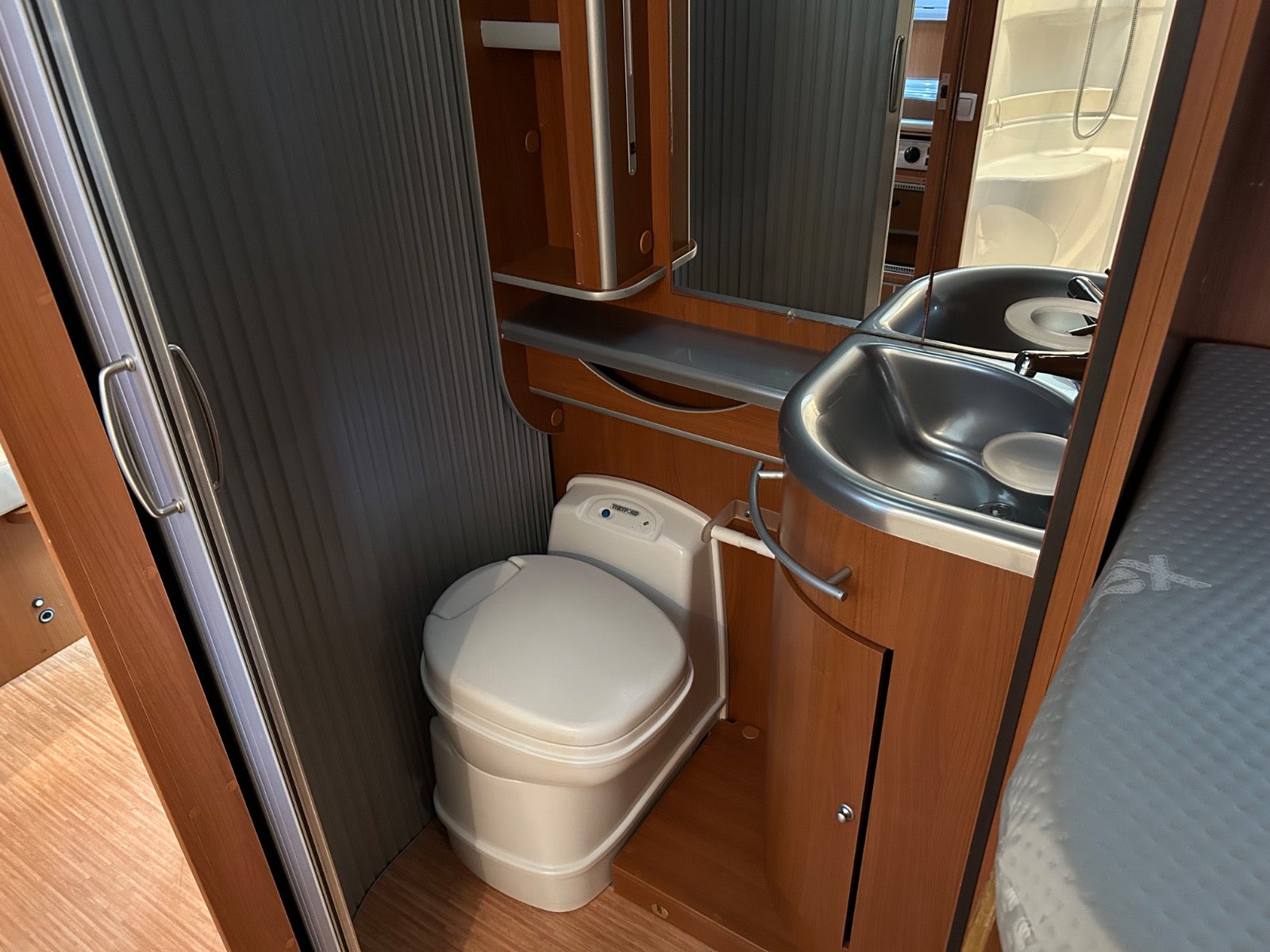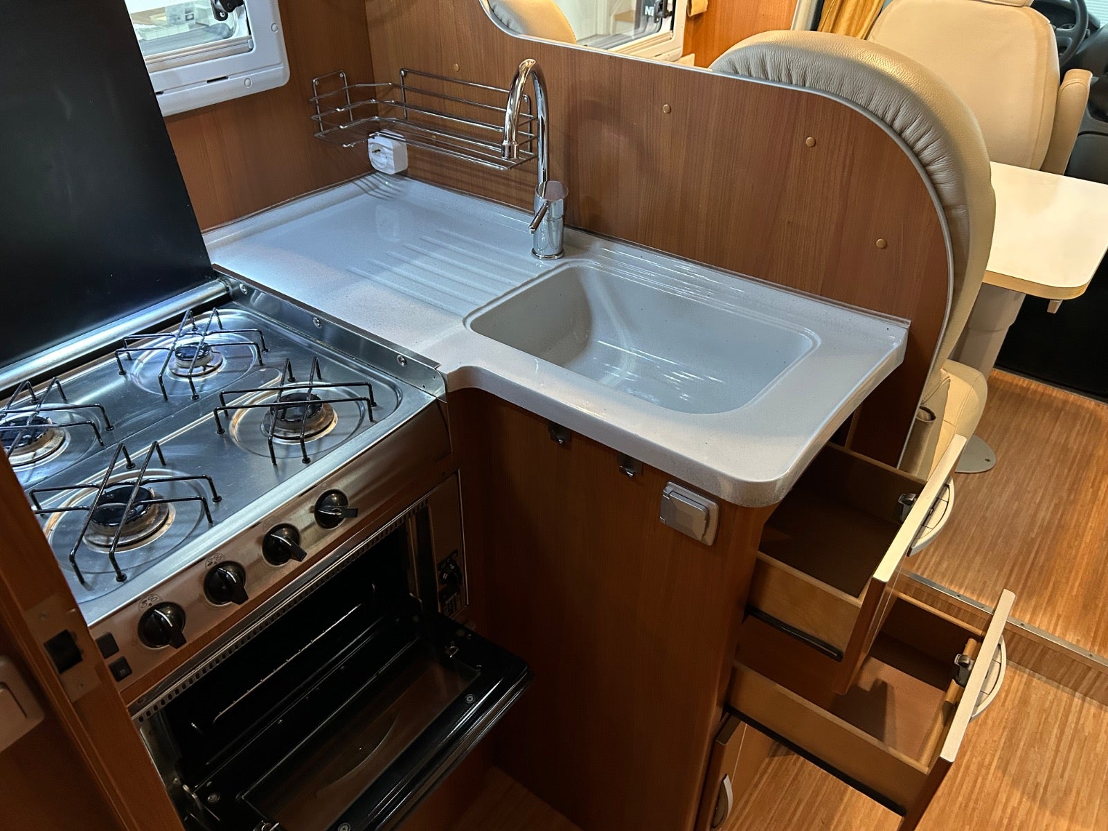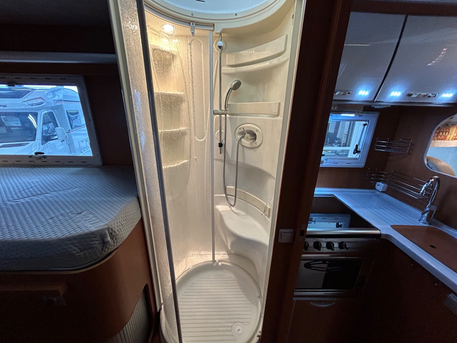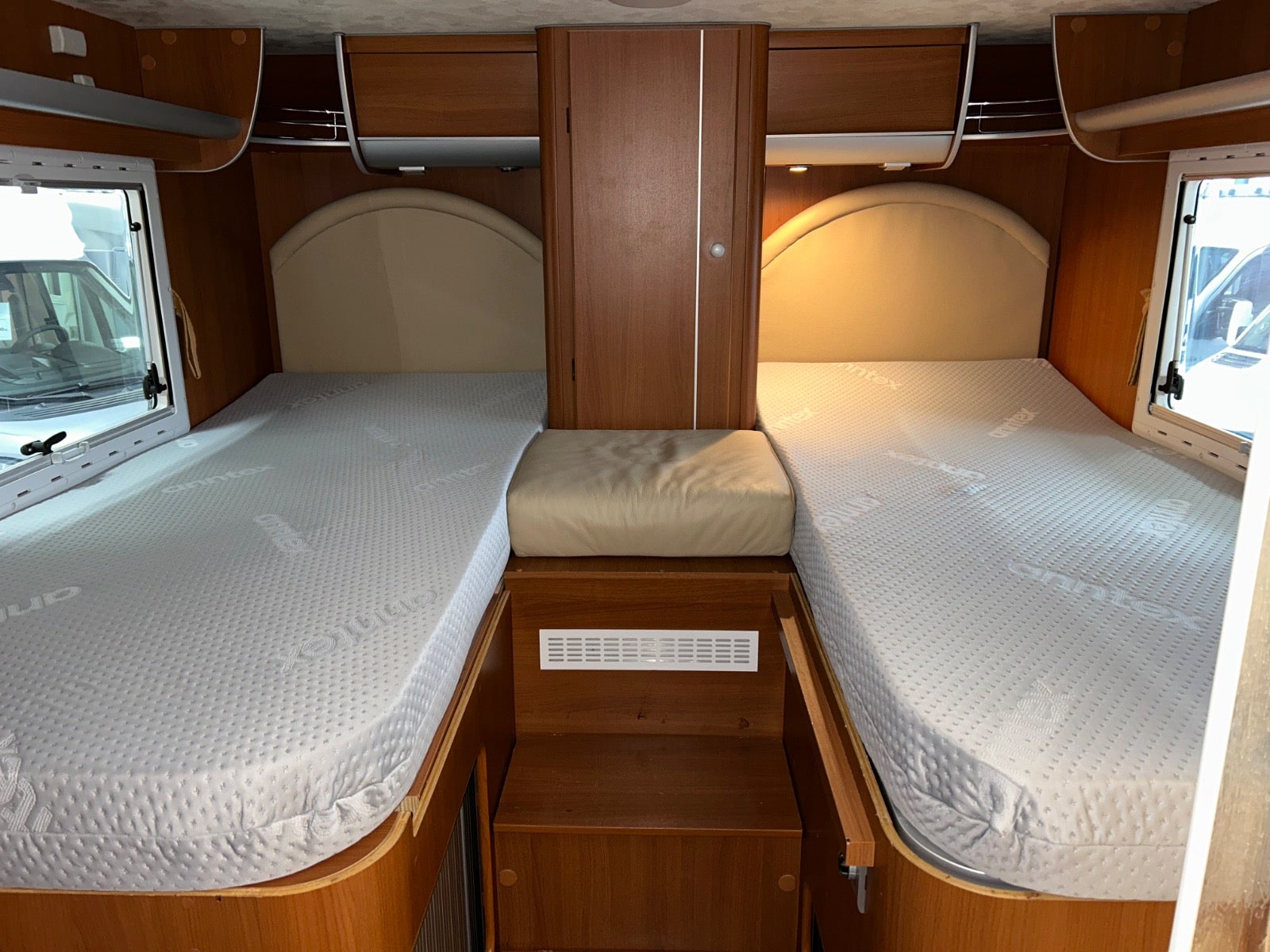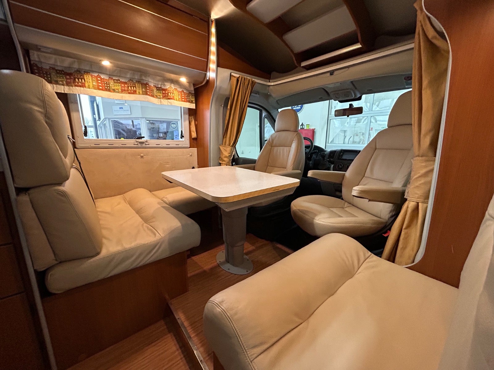 NYT læder i hele bilen/kabine - NYE AnnTex madrasser i de 2 enkeltsenge.Drejestole fører og passagerside, stor garage med 2 låger / døre, myggenet i døren, elektrisk markise, sog udsugning på wc, max fan, emhætte, 200 w solceller, 2 x 95 agm batteri, 2000W inverter, gas/kulilte/narkose alarm, dejlig stor separat brusekabine og toilet, duo gas - automatisk omskiftning mellem gasflasker, frostsikring på gasregulatorer, 4 gasblus, gas blæsevarme, køleskab / fryser, gas bageovn, udvendig gasudtag, cykelholder.