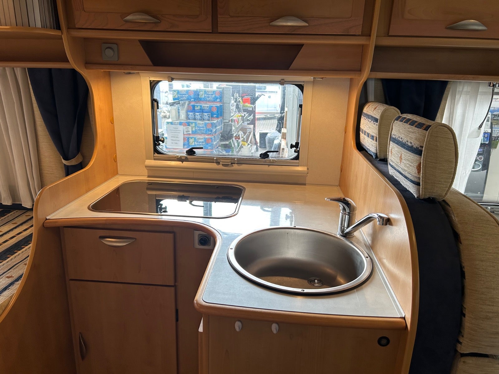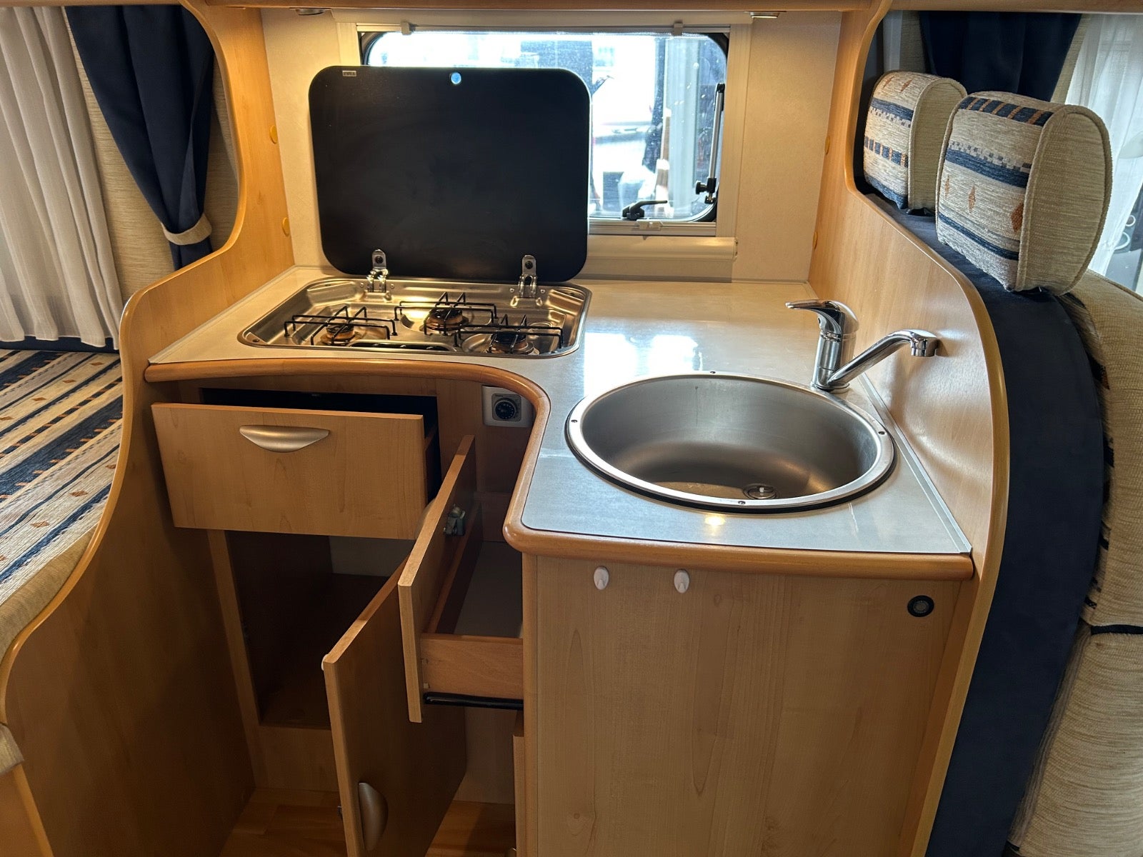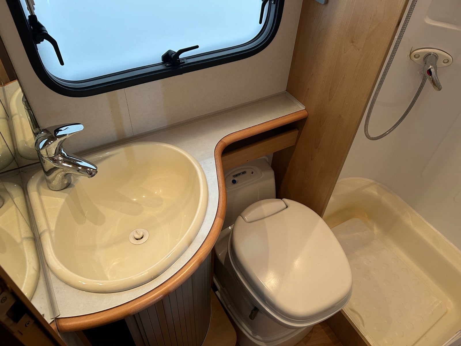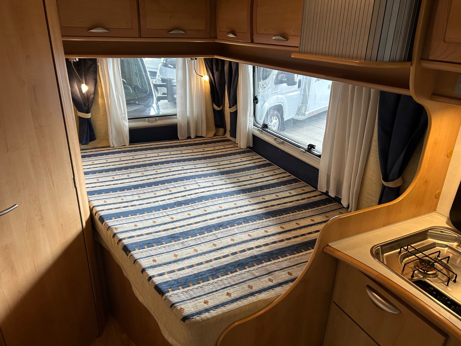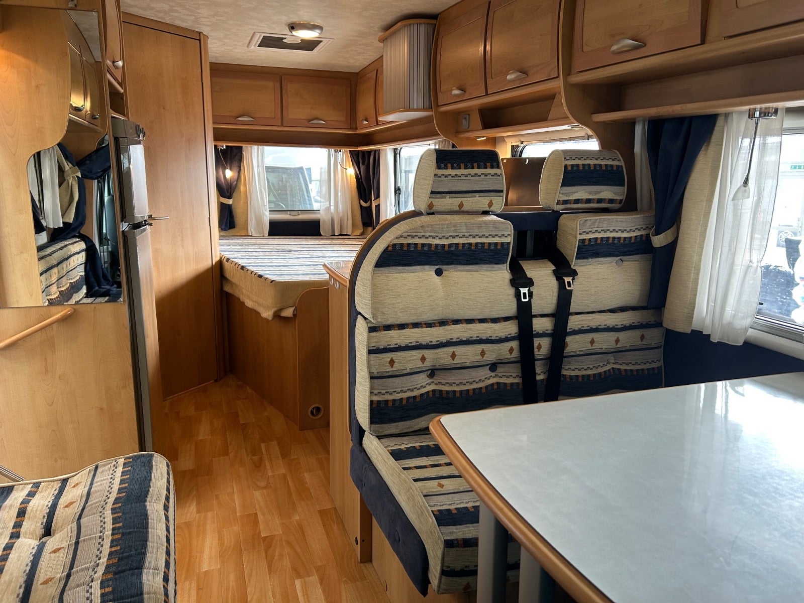 UNDER REPARATION OG KLARGØRING.God begynder camper med kun km 124.000. Stort wc med separat brusekabine - fransk seng med god adgang - vinkelkøkken og stort køleskab med separat fryser - 6 siddepladser med de 2 drejestole - truma combi blæsevarme, bildel med stor skærm m.m.