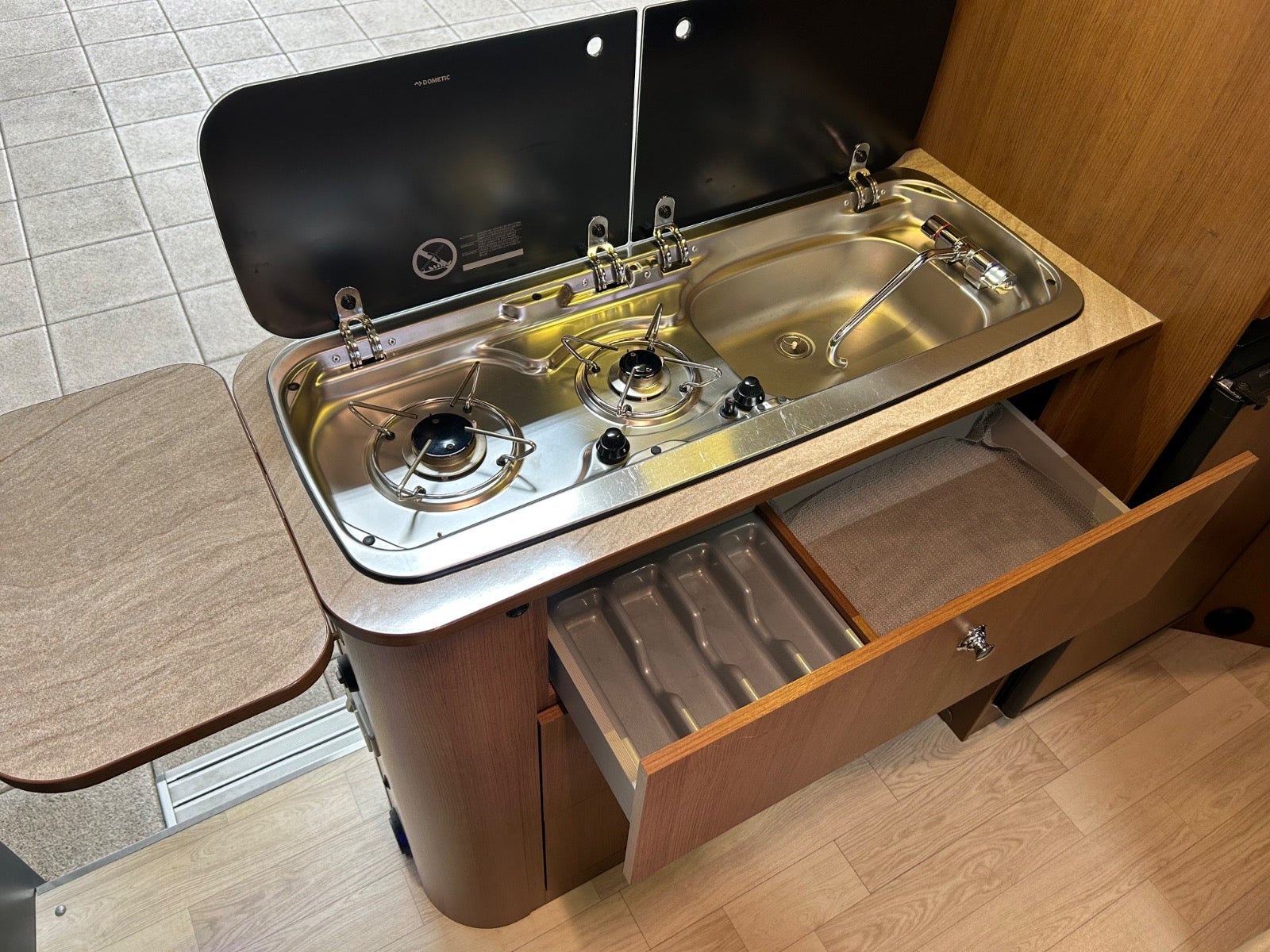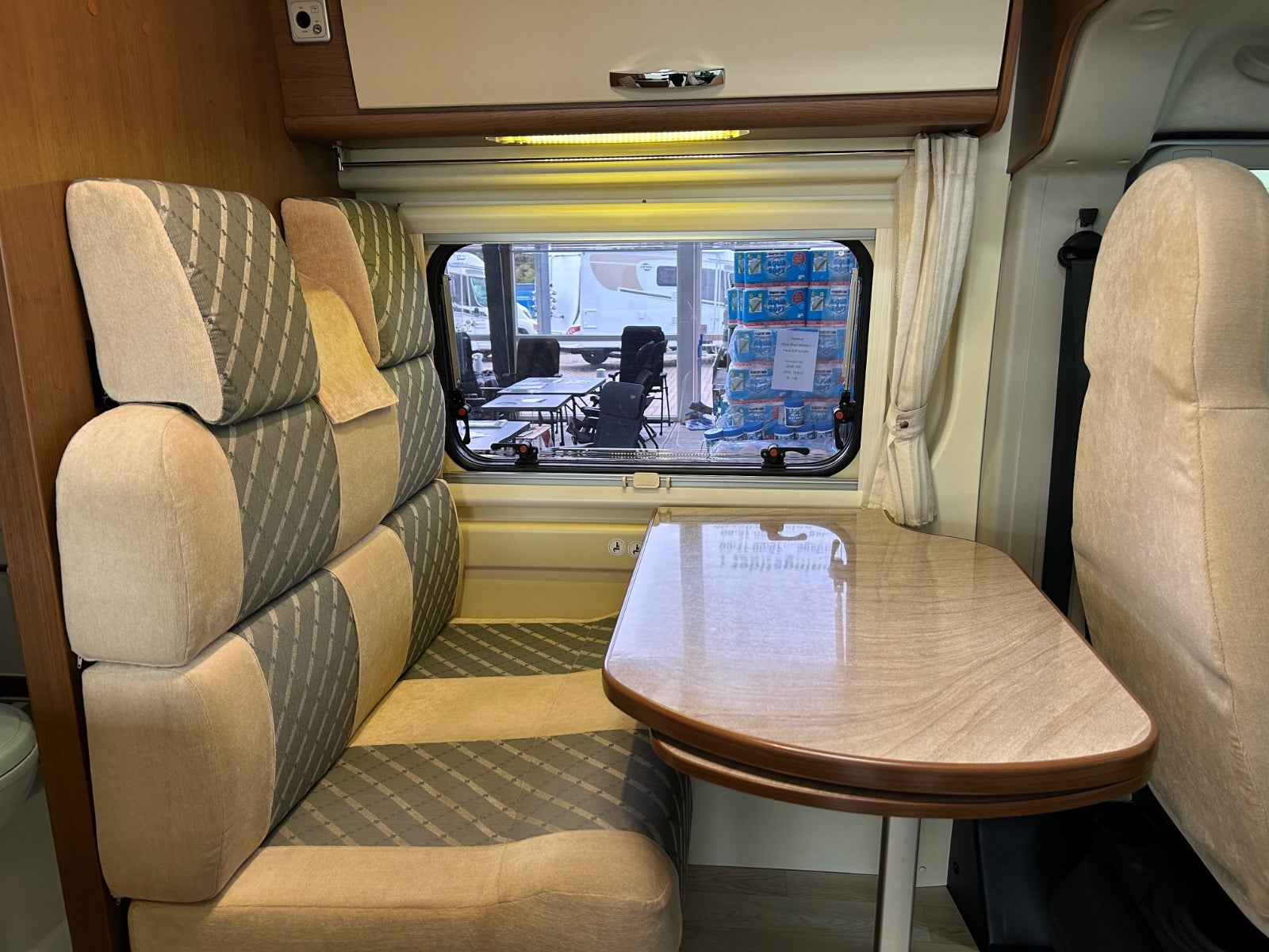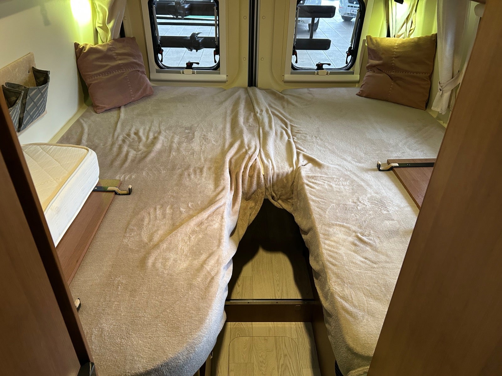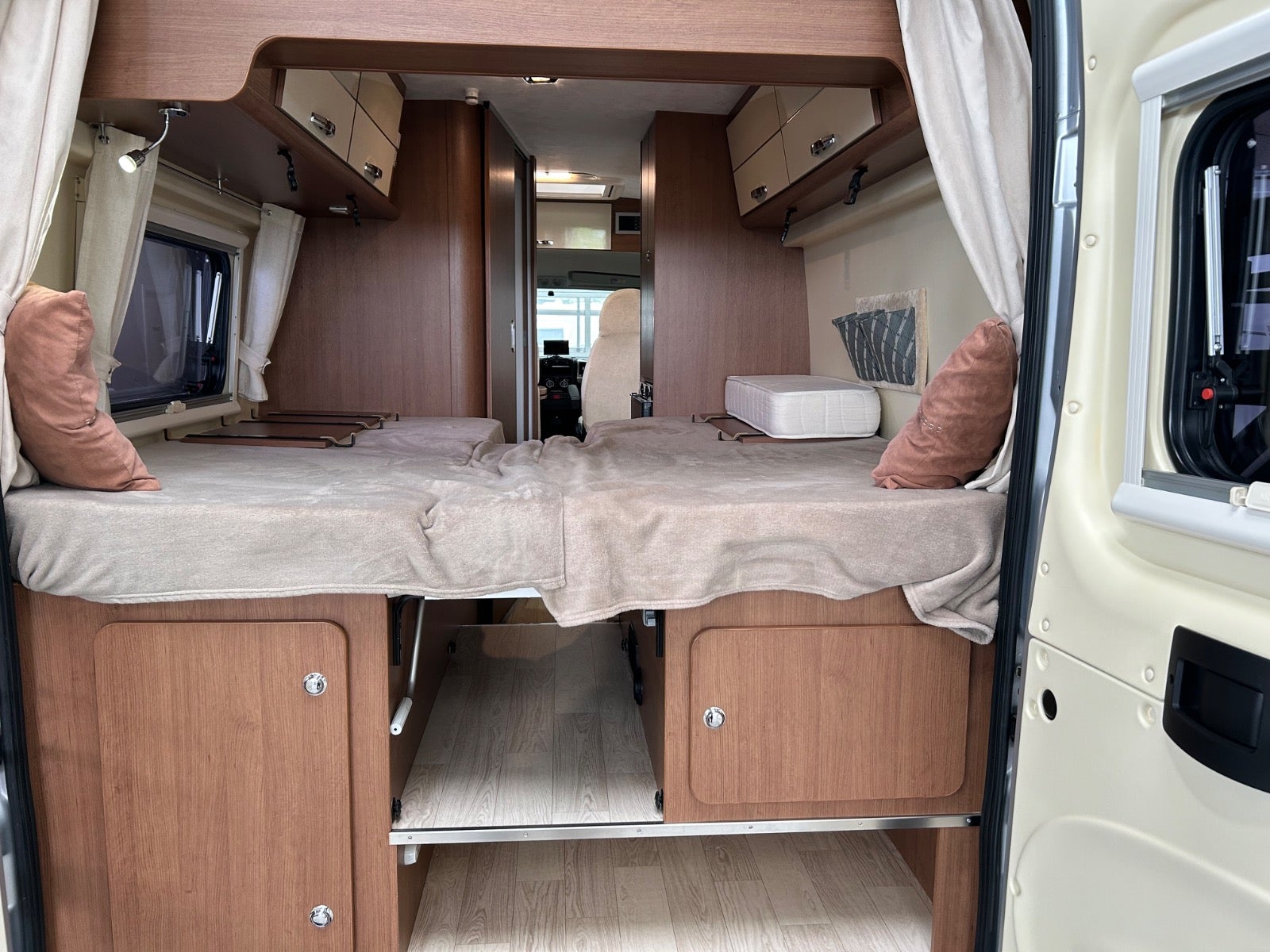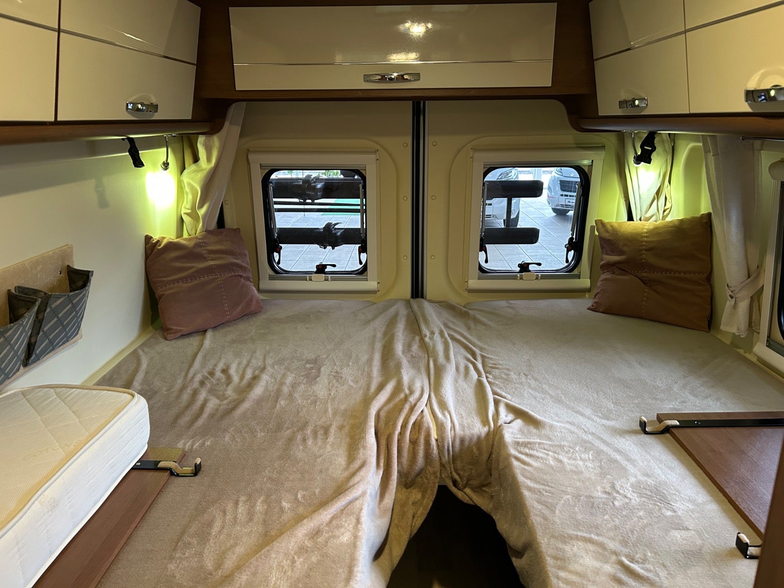 Ekstrem velholdt med 2 store enkeltsenge som kan laves til dobbeltseng - køkken med 2 gasblus og køl/frys til 12/220/gas med ventilator monteret - wc med god plads og bruser - 4 siddepladser med 2 drejestole. Cykelholder, camper navigation med bakkamera, gasalarm, el-trin, markise, plissegardiner i førerhus, webasto dieselfyr, truma 10 liter gasvandvarmer, 2 stk batterier i bodel, 150HK, kørecomputer, højdejust. forsæder, stofindtræk, el-sidespejle m/varme, led kørelys, aftageligt træk, aircondition, fjernb. centrallås, fartpilot, udv. temp. måler, el-ruder, navigation, db. airbags, esp, bakkamera, antispin. Prestige model med skørter m.m.Længde 650 bredde 210 højde 265.